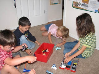 My neighbor had an emergency and asked if I could watch her kids for her, so we had an impromptu lunch and playdate yesterday. The last couple of times the four of them have gotten together they have played so very well, and today was the same! In the past the girls kind of paired off and the boys did too, but lately they have all four been playing together. It was such a pleasure to watch them making up superhero powers or playing Cars or making lunch in the kitchen without any bickering or fighting or pouting! It did get a little rowdy once or twice, but nothing too obnoxious.